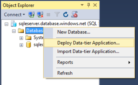 - Once connected to the Azure SQL Database, right-click the Database node and select Deploy Data-tier Application... to start the deployment wizard. Using the Next button or the wizard step links, run through the wizard up to the Select Package step.