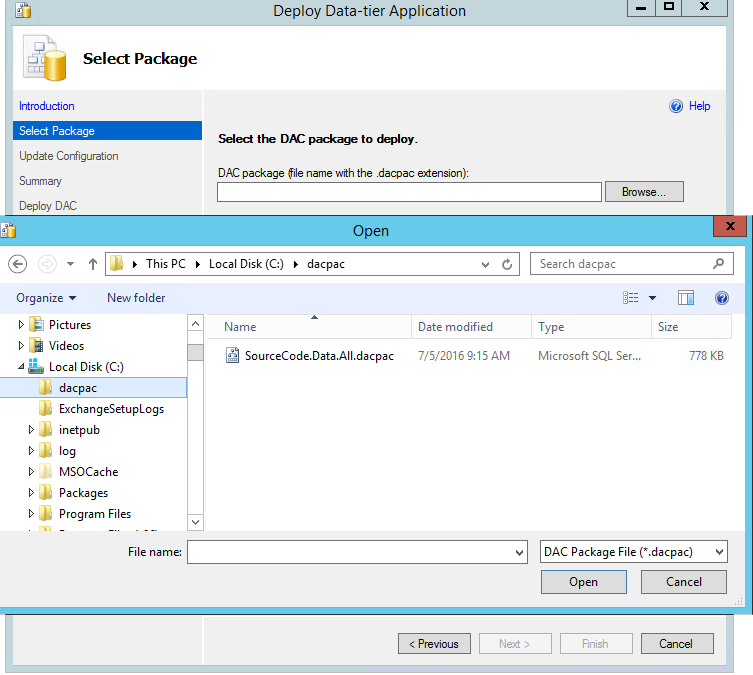 If you created a blank database when you created the SQL Database logical server, or already have an empty database added manually, you must use the Update Data-tier Application option by selecting it from the right-click menu of the Database node > Database Tasks. - On the Select Package step, browse to and select the SourceCode.Data.All.dacpac file that you extracted earlier.