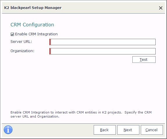 Ensure that the Microsoft CRM Server is started before adding the information to this page. CRM integration in K2 such as the CRM Entity Wizard is dependent on the information entered on this page.