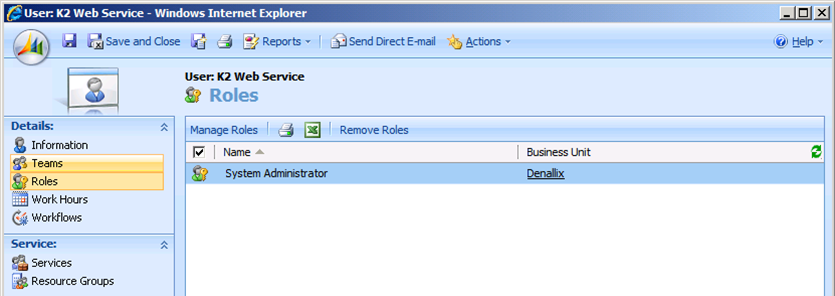 When enabling CRM integration, the Workspace Application Pool, Central Administration Application Pool, K2 Designer Application Pool and SmartForms Runtime Application Pool account and the K2 Service Account user(s) need to be added to the System Administrators group in CRM to prevent a “401” Unauthorized error. These rights are required as the CRM URLs are queried directly from SharePoint and not only via K2HostServer.