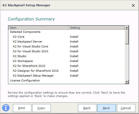The Configuration Summary screen displays the options captured by the Setup Manager Wizard. Confirm that the summary reflects the options you want to install, because once the Setup Manager starts the installation, the installer cannot be interrupted.