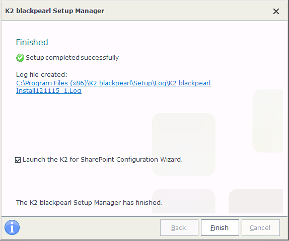 This Finished page appears when the K2 Setup Manager is complete. There will be a link to the log file that was created. This log file can be helpful when troubleshooting issues in the K2 Environment.