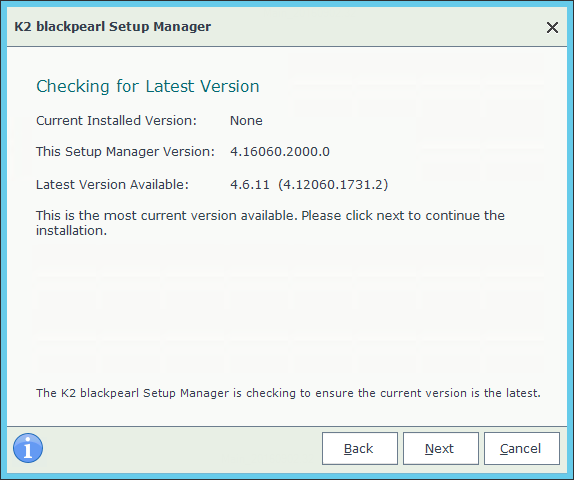Once the welcome screen has been displayed, the K2 Installer will verify online whether the version being installed is the latest available. Even though you may be installing the latest major version of K2, there may be an update which includes enhancements or fixes.