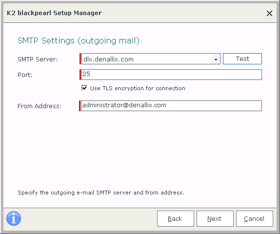 Note: For backwards compatibility considerations for future versions, the From Address specified here must be a unique e-mail address and mailbox dedicated for use by the K2 Server only. - Click Next to proceed.