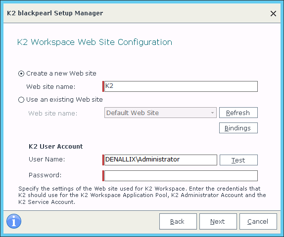 The name of the site that was created under IIS. Use the Bindings button to select which binding to use. Note: The site can be created without closing the K2 Setup Manager. Click Refresh to reload the list of available web site options. |