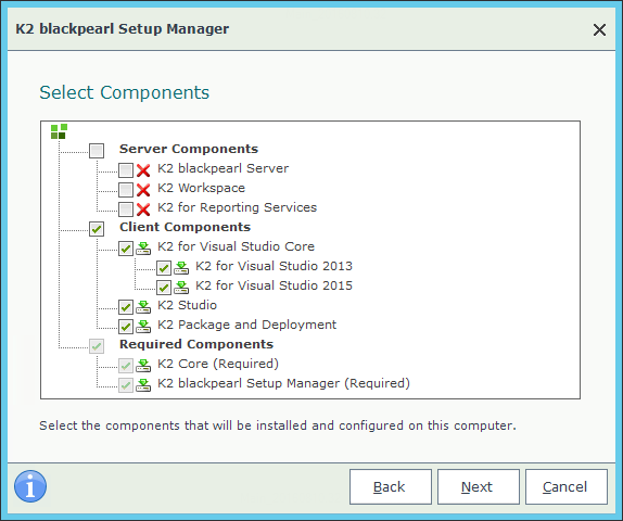 This page includes components that are required and cannot be removed from the components list. For example, the K2 Setup Manager is required to be installed with all K2 components.