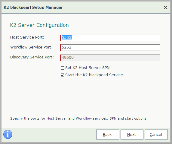 This check box is disabled by default, and will therefore not automatically configure the SPN settings for the K2 Host Server. If you enable it and click Next, you will be warned that you will be reconfiguring the current SPN configuration. If you click Yes, the check box will remain checked and the SPNs will be configured automatically. If you click No, the check box will be unchecked and you will have to manually configure the SPNs.