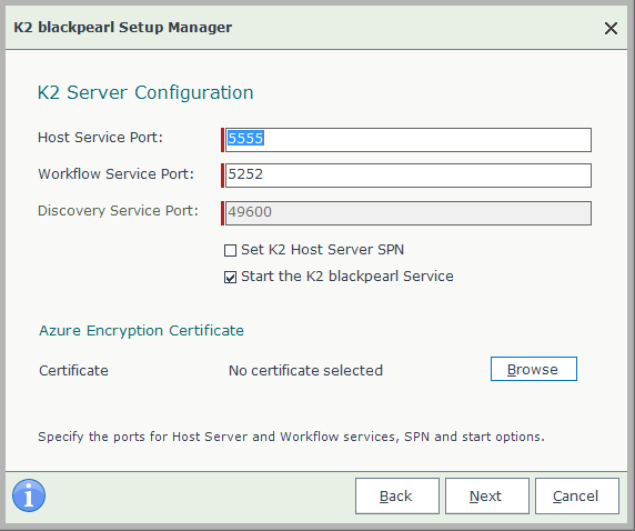 - Discovery Service Port. This should be a unique port that gets assigned to each server cluster you have in the environment. It is used by the K2 management tools to identify your clustered K2 servers in your environment. This port is only displayed if you are installing a K2 Server Farm. By default, port 49599 is used on non NLB environments, and port 49600 is used for NLB environments.