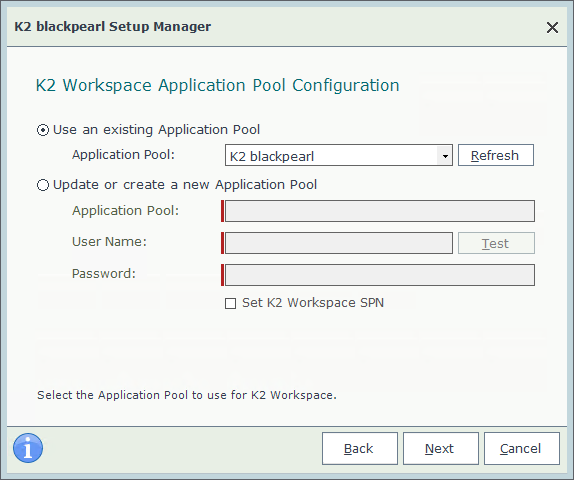 The K2 Workspace Application Pool Configuration page lets you create a new Application Pool for the K2 Workspace web service. A list of existing Application Pools, if there are any, is shown in the dropdown combo box. If an Application Pool does not already exist or a custom one is required, a new application pool can be created from the page as shown below: