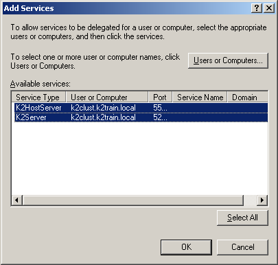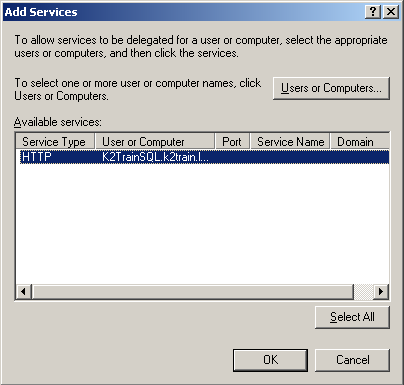 - Click OK. This will allow the K2 Web Service Account to delegate to the K2 Server Service Account.