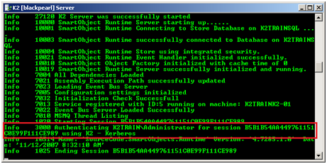 - Also, you should see a message in the K2 Server console window showing that Kerberos was used for authentication:
