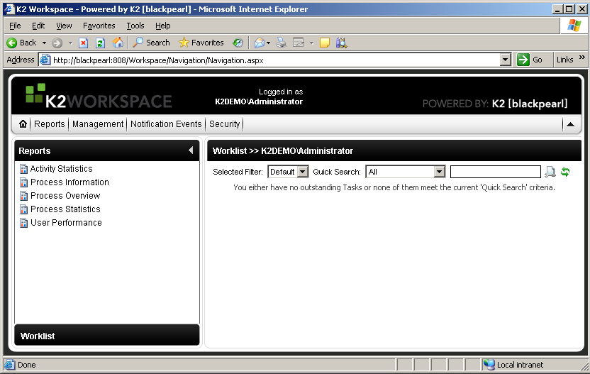 The K2 Server will start and initialize. You will see several messages starting the various components. Once you see the line stating "Info 7010 MSMQ Thread Listing", you know the service has started successfully. - Next, open Internet Explorer from the K2 Server machine. Access the K2 Workspace home page. You should see the K2 Workspace home page, with no items available in the worklist: