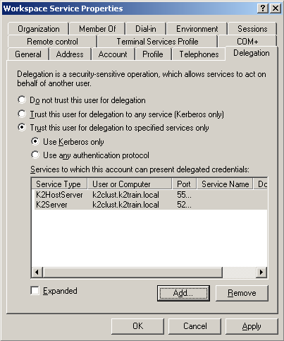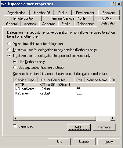Also, since the SQL Reporting Services reports will also be rendered in the K2 Workspace, the K2 Web Service Account should also be allowed to delegate to the SQLRS Account. - Click Add again.