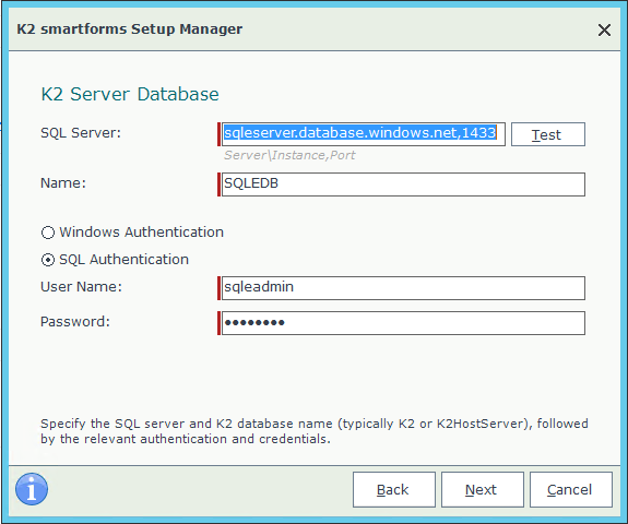 Remember to use the database name you created in the Update Configuration step of Install K2 blackpearl with SQL Azure, and use the server name, user name and password used when you created the database.