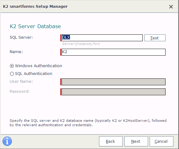 - If Windows Authentication is selected, the credentials of the K2 Service Account is used to establish the connection to the SQL Server.