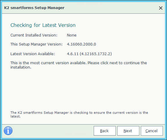 Once the welcome screen has been displayed, the K2 Installer will verify online whether the version being installed is the latest available. Even though you may be installing the latest major version of K2, there may be an update which includes enhancements or fixes.