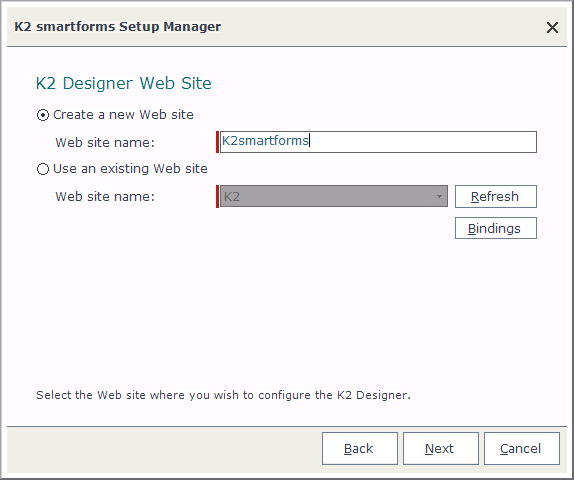 The name of the site that was created under IIS. If the name is left with the default setting for example K2 then the K2 Designer (design time) URL will be similar to "http:// K2/designer" where K2 = the web server name. When selecting "Use an existing Web Site", this site must already exist Note: The site can be created without closing the K2 Setup Manager. Click Refresh to reload the list of available web site options. |