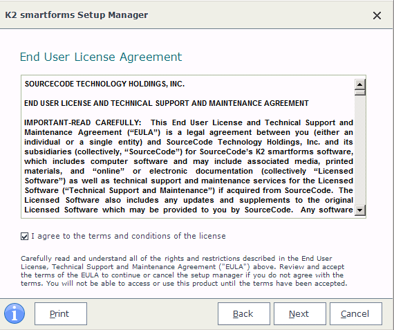 The EULA describes the terms and conditions under which the (Undefined variable: K2Variables.ProductName) (in whole or in part) can be installed. The software can only be installed when you agree to the terms and conditions as outlined in the EULA.