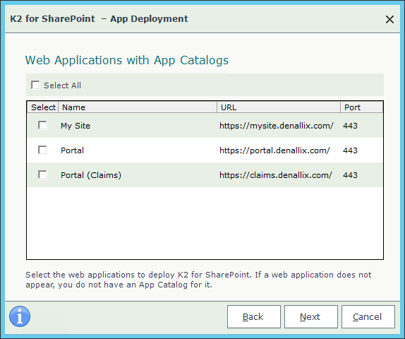 This page shows you which of your Web Applications have App Catalogs and allows you to select to which you want to deploy the K2 App. If you know you have a particular Web Application that is not present on this page, it means you do not have an App Catalog for it.