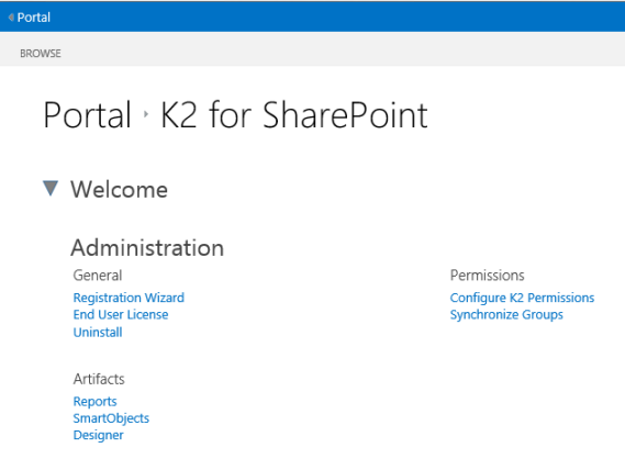 - You can start the Registration Wizard by selecting K2 blackpearl for SharePoint, which opens the K2 for SharePoint settings page, then selecting Registration Wizard under the Administration > General headings.