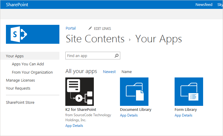 After updating the K2 components using the K2 for SharePoint Setup Manager and adding the App from the SharePoint Store, you need to add the K2 App to the SharePoint Site.