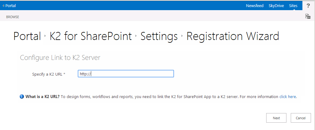 - You must install and register the K2 for SharePoint app on every site you wish to use it on. The Registration Wizard will automatically navigate between pages if it discovers that the root site in the site collection has already been configured.
