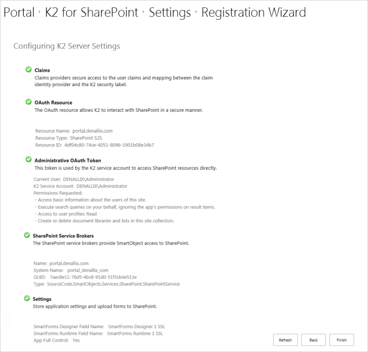 - When the K2 for SharePoint configuration completes, the Configure Server page displays the configuration status for OAuth, Claims, and the SharePoint Service Brokers (green check-marks appear), click Next.