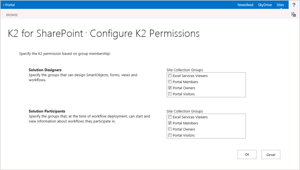 - By default the K2 Permissions are configured in the background for Solution Designers and Solution Participants to Portal Members and Portal Owners Site Collection Groups. This screen is not be shown by default, but these permissions can be changed from the K2 for SharePoint > Settings page.