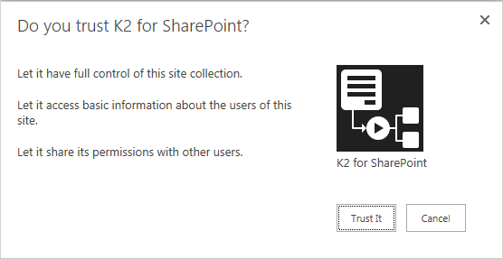 - A window displays asking you to trust K2 for SharePoint. Click Trust It.