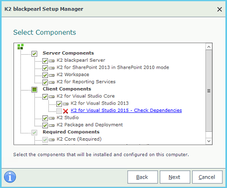 - After selecting Modify from the initial screen, you can only select components to add if you open the K2 Setup Manager from the C:\ K2 blackpearl installation folder (by checking the check box next to the listed component), or by removing an existing component (by unchecking the check box next to an installed component).