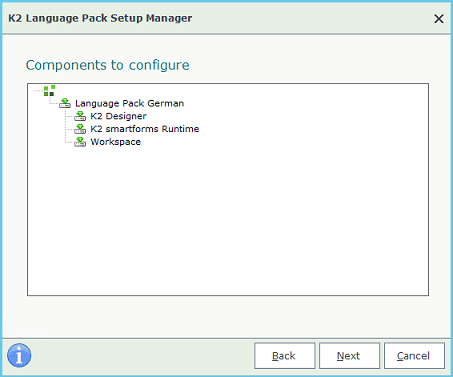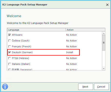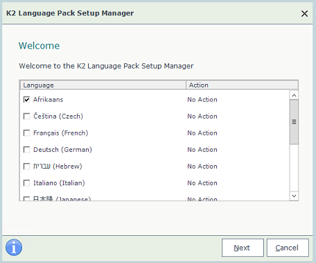 - Run the K2 Language Pack Setup Manager (Setup.exe or browse to Start > All Programs > K2 blackpearl > K2 Language Pack > K2 Language Pack Setup Manager).