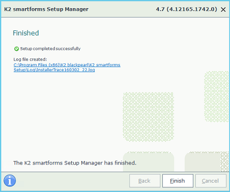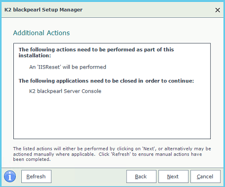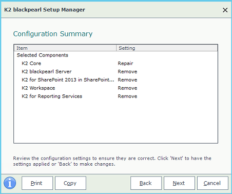Once you have your K2 environment up and running, you may need to modify components or change configuration settings. Re-run the Setup Manager to add or remove components, or to change configuration settings.