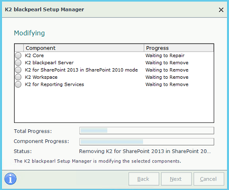 - When running the Setup.exe from the folder where K2 blackpearl had been installed to, the Modify option will only show those components that are installed. You can then select which ones to remove.