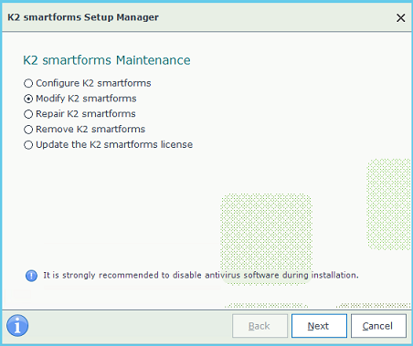 - Run the K2 smartforms Setup Manager (Setup.exe) and select the Modify K2 smartforms option.