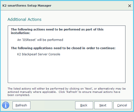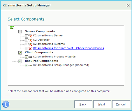 If, after the initial installation of K2 smartforms, you need to add additional components to an existing server, rerunning the K2 Setup Manager will allow you to add them.