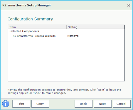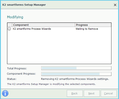 The Modify option allows you to selectively add and remove K2 smartforms components. You can install and remove different components during the same session of Modify. For example, you can select to uninstall a component while at the same time installing a different component.