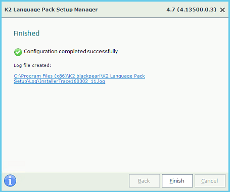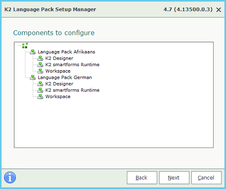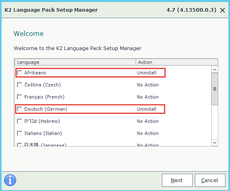 The install / uninstall process for the K2 Language Pack is modular, meaning single or multiple languages can be installed or uninstalled simultaneously.