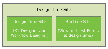 Refers to the site that hosts the K2 Designer (used to build SmartObjects, Views and Forms) as well as the Workflow Designer. The Design Time site consists of two sites with the design time portion to host the designer and a runtime portion to host the running / testing of built artifacts.
