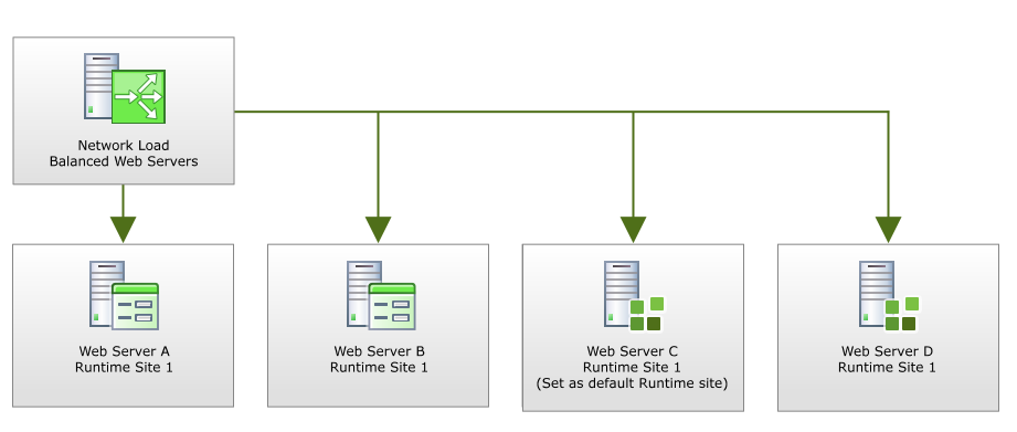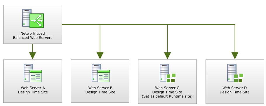 When in a distributed environment it is possible to have multiple Design Time sites hosted on web servers that are part of a NLB set up. In this instance one of the Design time sites can be used as the runtime portion for all the other Design time sites.