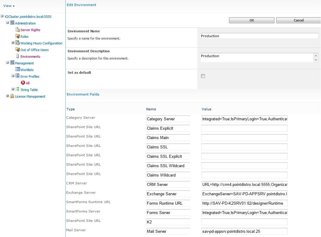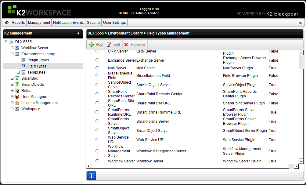 The environment Library Field types will be automatically added by the K2 Setup Manager. These can be changed in K2 Workspace> Management Console> Environment Library > Field Types. Depending on the selection made during installation with regards to the design time versus runtime, the system will determine the available entries to be modified. Below is an example of what will be visible in Workspace for an environment where the design time and runtime sites are separate.