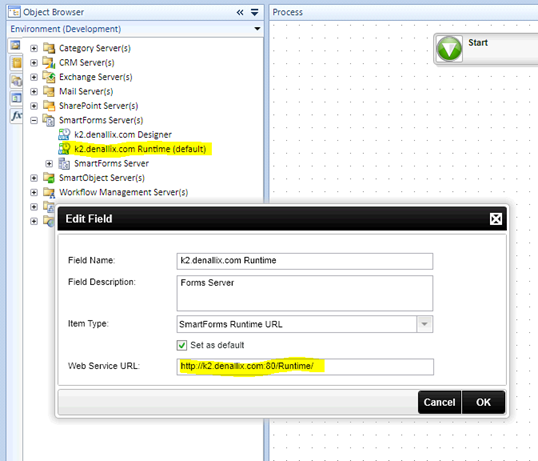 As the Design Time Site consists of the design element and then the runtime element it is possible to split these elements with each one hosted on a different site. This means that the runtime element (URL) can be hosted with the Runtime site leaving only the design element(URL) to be hosted on the Design Time site. This is achieved by ensuring that the ‘Set as default runtime URL’ checkbox on the K2 Designer Web Site panel is not checked and then rather checking the ‘Set as default runtime URL’ checkbox on the SmartForms Runtime Site.