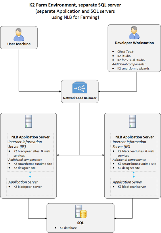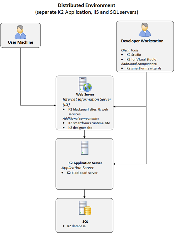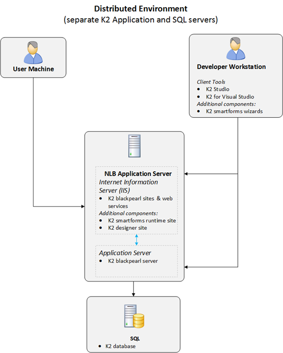 Although it is possible to install the K2 web components (K2 workspace, K2 smartforms runtime site, K2 designer site) and K2 application server components on separate physical servers as described in this diagram, for better performance the recommended approach is to install the website components and application server components on the same physical machine, as described in Separate SQL Server and Distributed Environments.