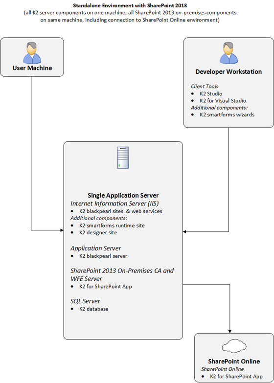 Standalone installations are better suited for low-load environments such as a development or proof of concept environment. Since all components are installed on the same physical server as the K2 Server, there are no credentials passed between servers except to SharePoint Online.