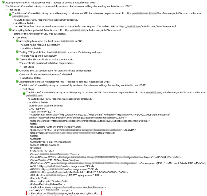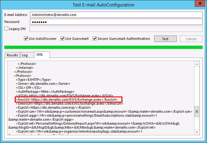 - If the EWS URL is not returned in the XML Autodiscover response, there is a configuration problem on the Exchange environment.
