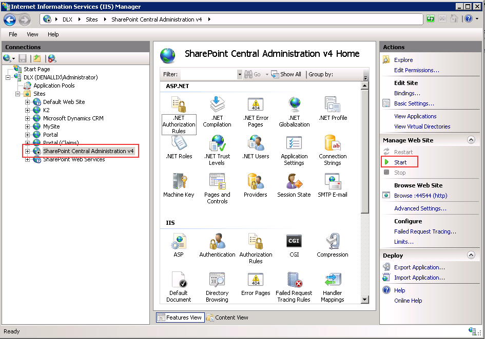 - Expand the relevant Server and Sites nodes and select the site where the authorization rules need to be edited.