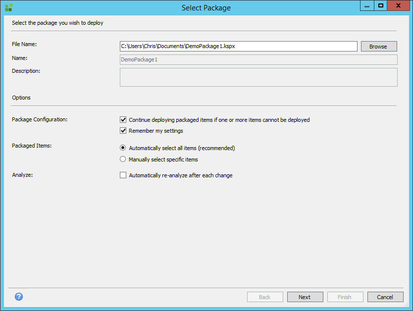 - Select the Automatically select all items option if all items in the current deployment package should be deployed. When Next is clicked in the Select Package window, all items within the deployment package will be selected by default.