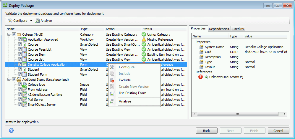 - All items for deployment will be validated and configured. (Note the Missing Reference status of the Application Approved and Denallix College Application items.)