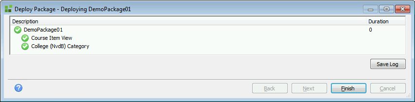 - The Deploy Package – Deploying window will load. This is a list of the packaged items and their readiness status. The time taken to deploy the package’s artifacts and dependencies will be shown in the right-hand column once deployment is complete. Where a status icon to the left side of a deployed item shows a green check mark, the item has been successfully deployed.