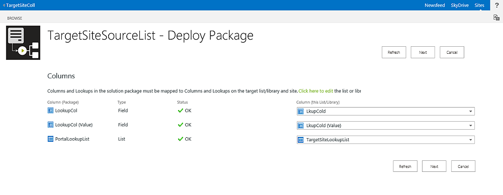 Use the Column (this List/Library) drop-down to select the matching column in the target environment, or use the Click here to edit link to open the list or library settings screen so that you can add the required column. Use the Refresh button after changing settings so that the new properties are available.