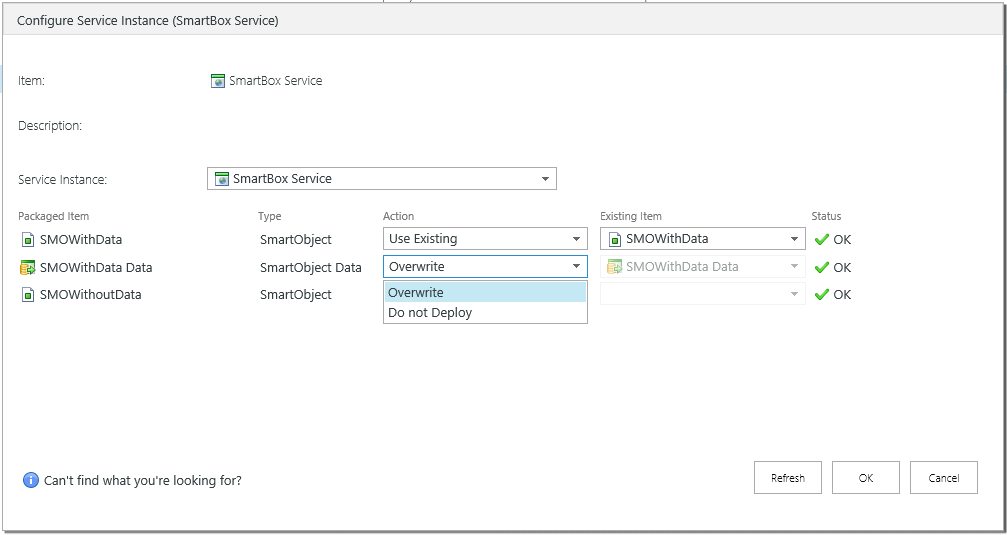 Use the Configure button to make any changes that are needed for this local environment. If SmartBox data was included in the package and you configure the parent SmartObject to use a SmartObject already deployed to the target environment (Use Existing), configure the SmartObject data artifact to Do not Deploy to keep the data of the target environment, or Overwrite to write the packaged data to the target environment (overwriting the data already there). When deploying SmartObject data artifacts with a new SmartObject (Create New) you have the option to Deploy or Do not Deploy the data.